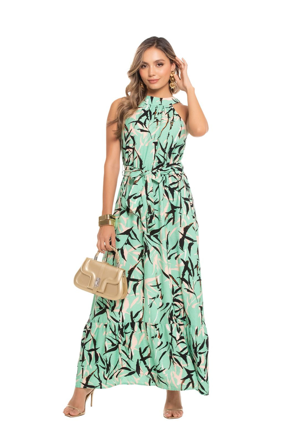 El mix de tonos verdes con pinceladas negras y rosadas hace que este vestido se vea exclusivo, moderno y con presencia.